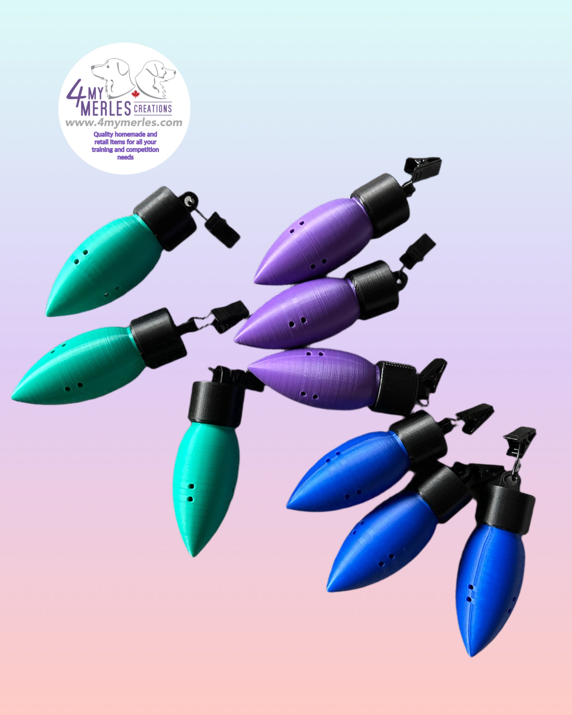 Our newest edition of scent vessels is our Christmas bulb for aerial finds. There is a removable clip included with each bulb. Each bulb is approximately 3.75” with the cap. Our 3d printed products for scent are made with PLA. The bulbs come in packs of 4 and do not include a line to attach to as seen in the second picture