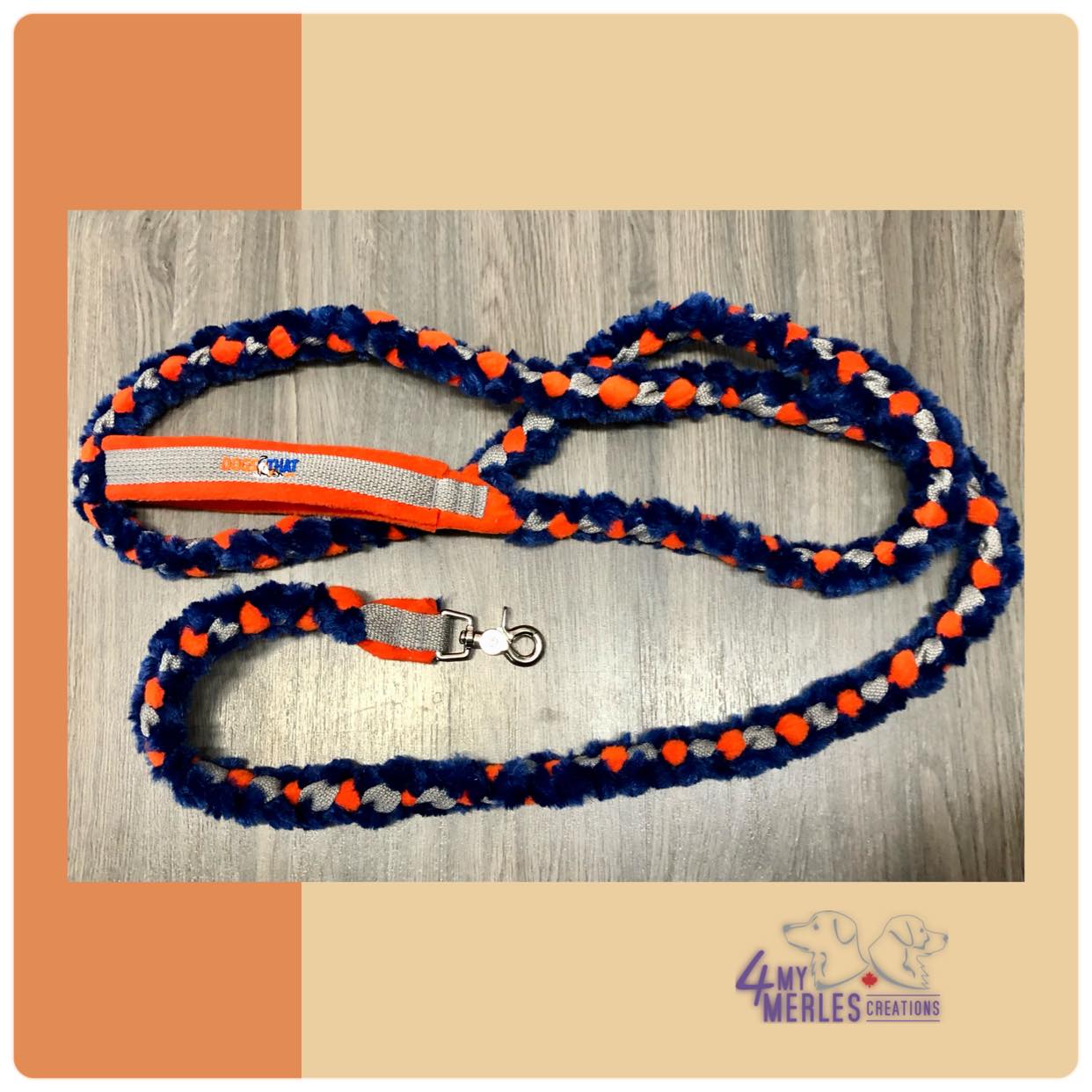 This leash is approximately 9ft in length. Made with the same materials of a regular carbon plush leash, but in Dogs That colors. Grey webbing, is the webbing, and depending on availbility it could be blue or orange plush and then the opposite colour for the fleece.. This is a training leash, so it only comes in the specified size. The Dogs That logo is embroidered on one side of the handle with an option to put a name on the other side. Overall leash width is approximately 1″.