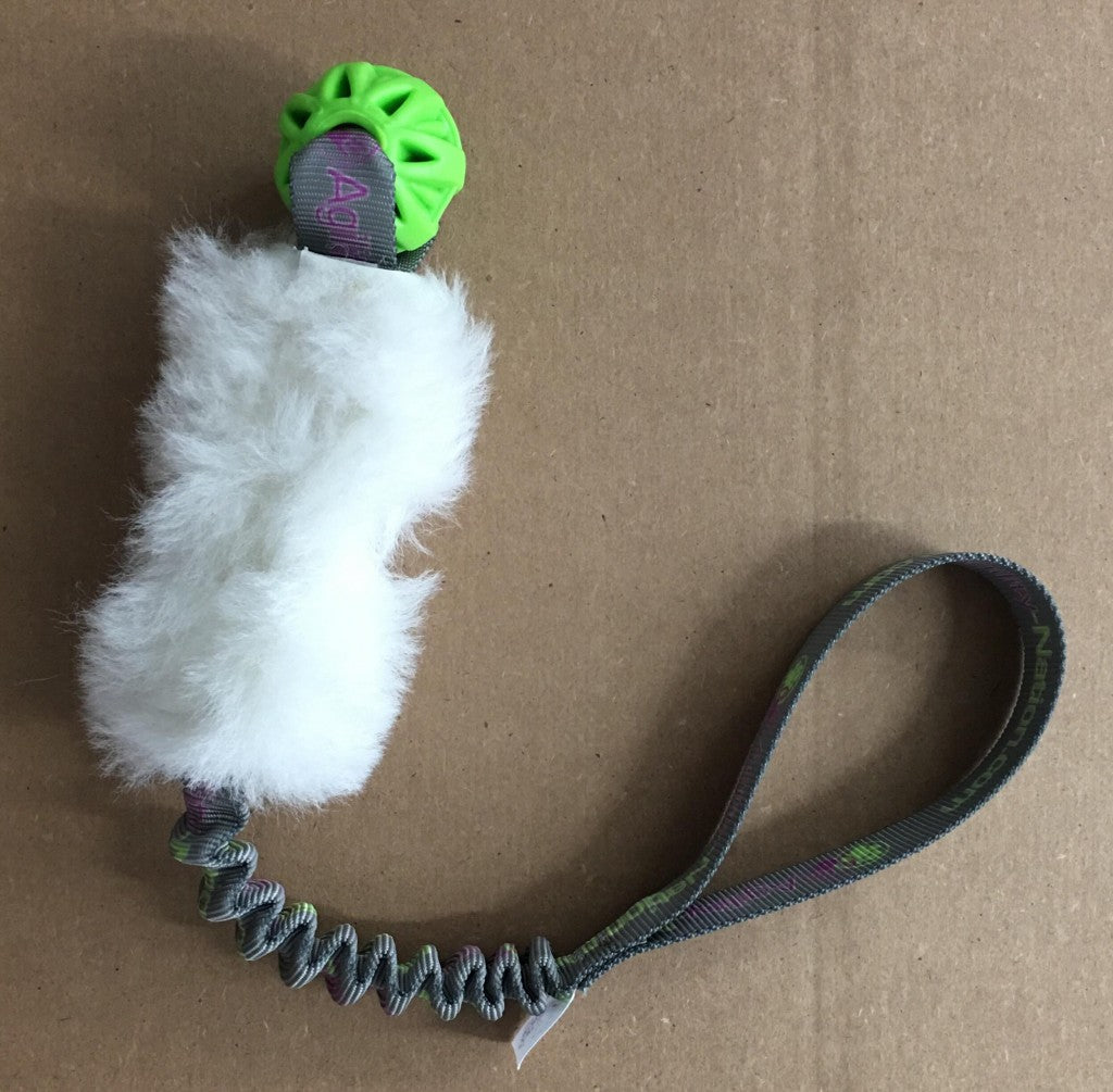 The MegaBaa is made with a small ball, choice of tubular webbing and of course just enough sheep shearling to drive the dogs wild. Great training size toy, fits easily into a pocket