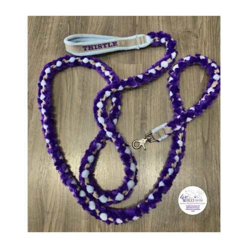 This leash is approximately 9ft in length. Made with the same materials of a regular carbon plush leash. Grey webbing, is the base but you can choose the plush and fleece. This is a training leash, so it only comes in the specified size. Overall leash width is approximately 1″.
